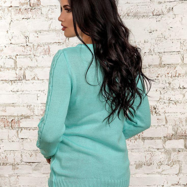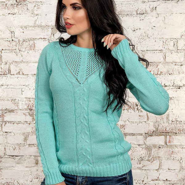 Оригінальний джемпер прямого силуету з ажурним ліфом, зроблений красивою в'язкою. Довгий рукав і низ виробу виготовлені в'язанням-гумкою, для оптимальної посадки. Горловина оформлена круглим вирізом. Сезонність: Зима — Весна.Склад: 30% вовна, 70% акрил. Довжина виробу — 65 ± 2-3 см. Довжина рукава — 62 ± 1-2 см.Розмір універсальний 42-44-46.Розмір моделі 170 см. Розмір моделі — 42.