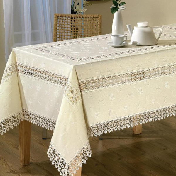 Скатертина жакардова з мереживом у 3 яруси. Колір бежевий. Виробник Туреччина. (Tabe). Склад — 100% Поліестер Розмір 160-220 см
