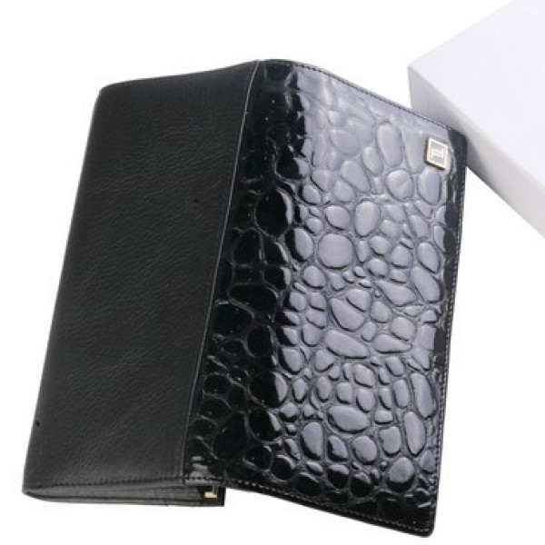 Жіночий гаманець виготовлений із якісної щільної натуральної шкіри, має лакову вставку тільки на клапані.