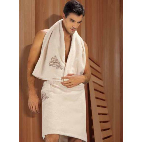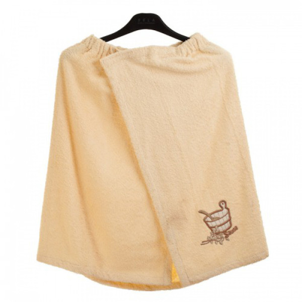 Махрова спідниця бежевого кольору для сауни та бані виготовлена зі 100% бавовни. Кільт-спідниця дуже зручний аксесуар для відвідування лазневих комплексів. Вона м'яка, зручна та чудово вбирає вологу. Спідниця махрова для сауни або лазні з кишенею та вишивкою для чоловіків.