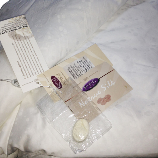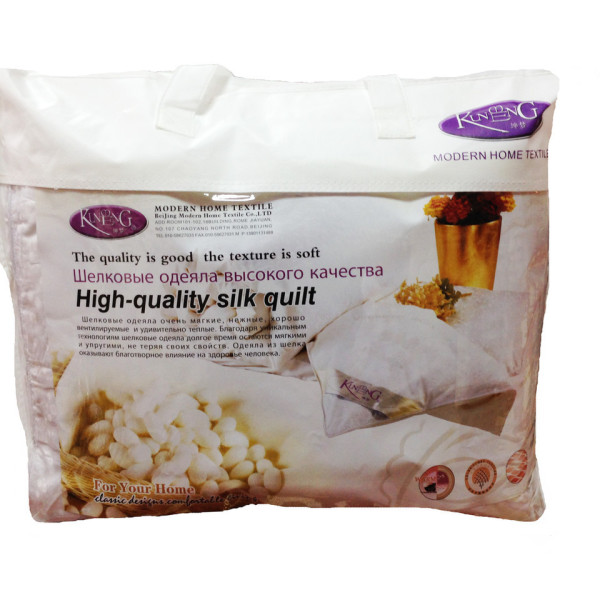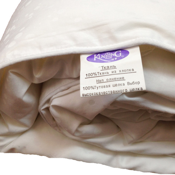 Ковдра з натурального шовку від тм. "Kunmeng". Чохол ковдри — жакардовий сатин. Наповнювач — 100% тутовий шовк Розмір 200-230 см. Вага — 2.5 кг. Наповнювачем для ковдр Kunmeng слугує 100% натуральний шовк тутового шовкопряда. Для виготовлення всієї продукції Kunmeng використовується шовк тільки вищих сортів. Відмітна особливість цих сортів — білосніжний колір, м'якість, блиск, однорідна нитка завдовжки до 1,5 кілометрів. Шовк — унікальний природний матеріал, який пристосовується до температури зовнішнього середовища та здатний підтримувати ідеальний для організму людини мікроклімат. Ковдри представлені під маркою Kunmeng — розроблені для комфортного здорового сну, щоб зберегти молодість і красу, якомога довше. Переваги шовку перед іншими натуральними матеріалами. ― регулює температурний режим (Вам тепло взимку та не жарко влітку); ― гіпоалергенність (шовк — єдиний природний матеріал, який не викликає жодних алергічних реакцій); ― стійкий до бактерій; ― повністю виключає можливість появи пилових кліщів (на відміну від пухових виробів); ― наповнювач із шовку не звалюється всередині подушки (завдяки однорідності шовкової нитки); — стійкий до тривалої експлуатації.