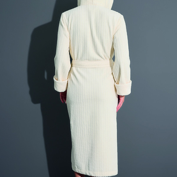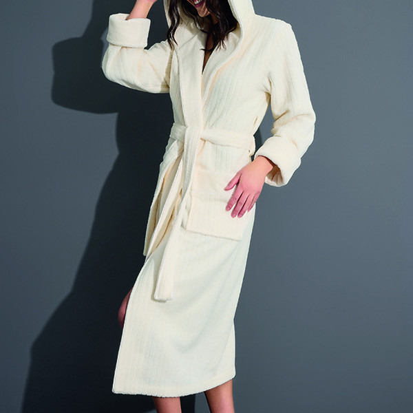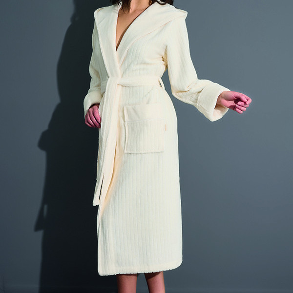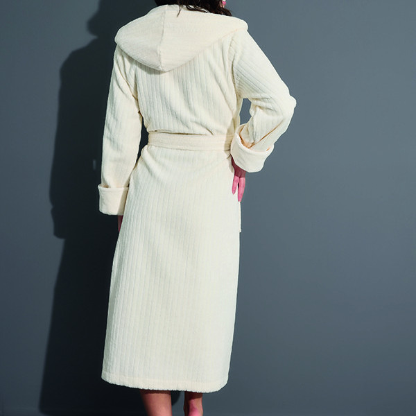 Махровий халат із капюшоном із бамбука та бавовни. Зовнішня сторона халата — велюрова (велюр має приємний приглушений матовий відблиск і протистоїть утворенню затяжок), а внутрішня сторона з петельчастої махри, що створює легкий масажувальний ефект. Подовжена модель, широкий манжет (легко регулюється за довжиною руки), повноцінні кишені.