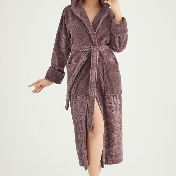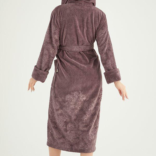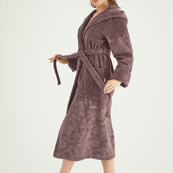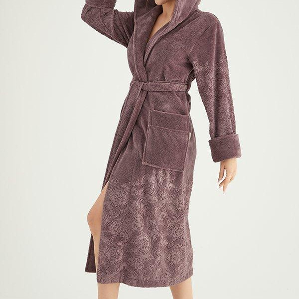 Махровий халат із капюшоном із бамбука та бавовни. Зовнішня сторона халата — велюрова (велюр має приємний приглушений матовий відблиск і протистоїть утворенню затяжок), а внутрішня сторона з петельчастої махри, що створює легкий масажувальний ефект. Подовжена модель, широкий манжет (легко регулюється за довжиною руки), повноцінні кишені.