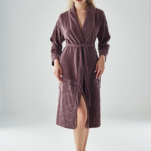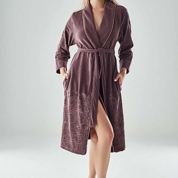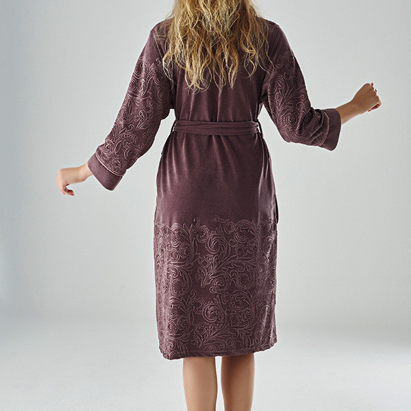 Цей розкішний халат даруватиме своїй господині комфорт, затишок і прекрасний настрій! Підлоги халата та рукави прикрашені рельєфним малюнком, який створюється за допомогою гарячого преса.Незабутнє відчуття м'якості, легкості та сучасного забарвлення!