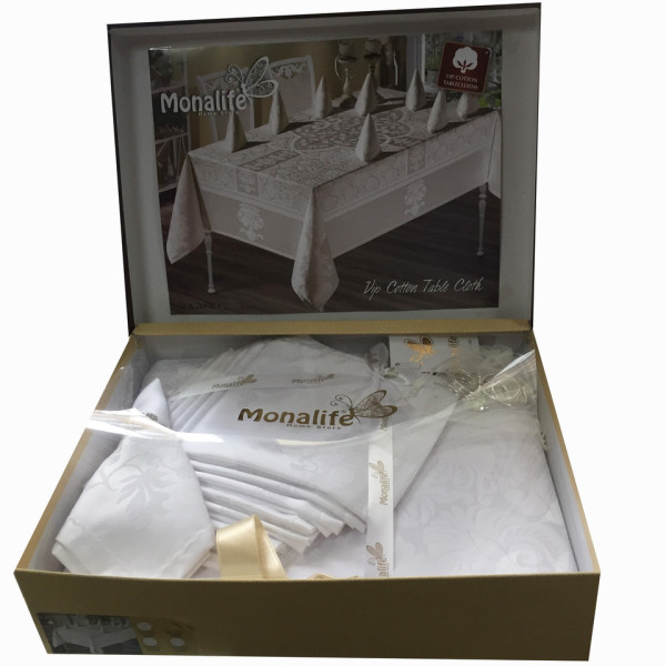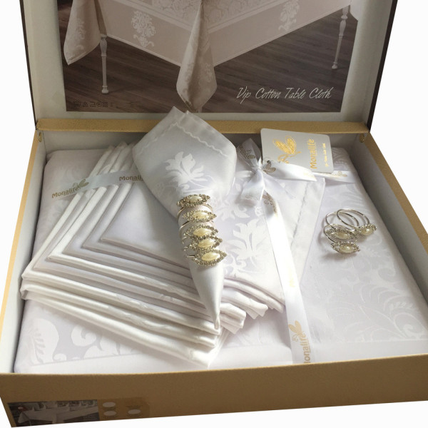 ПРОЗИВчик ТУРЦІЯ тм "MONALIFE" СКЛАД 80% ХЛОПОК 20% ПОЛІЄ СТЕР У КОМПЕКТ ВХОДИТЬ СКАТЕРТИ 150-220 см _1 шт САЛФЕТКИ 35-35 см — 8 штук КІЛЬЦЯ З КАМНЯМИ SWAROVSKI -8 штук