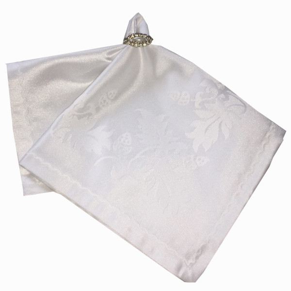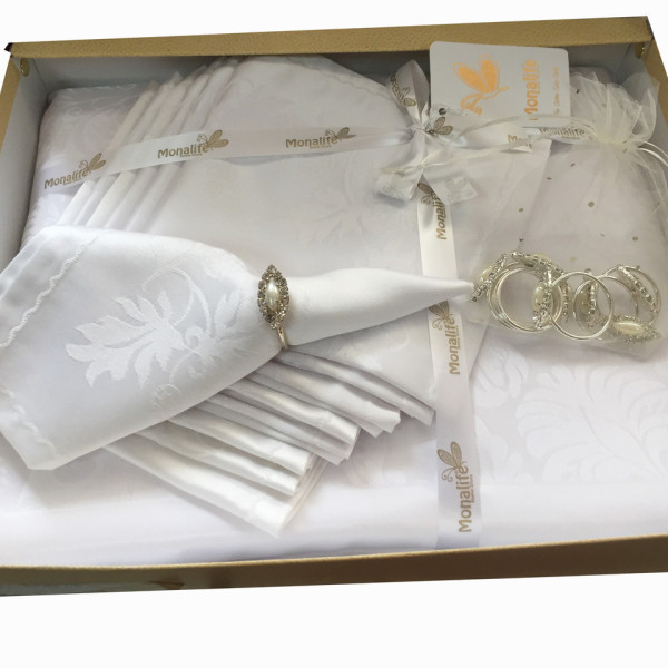 Ошатна білосніжна скатертина в подарунковому пакованні із серветками, кільцями з камінням Swarovski