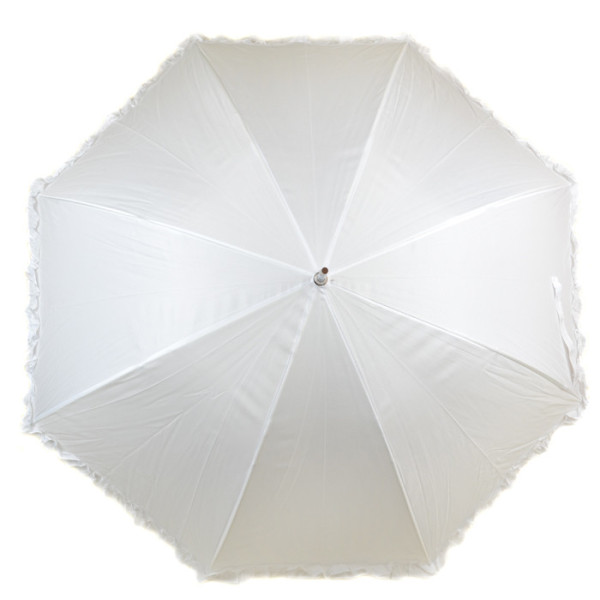 Парасолька жіноча біла тростина в дуже ніжному жіночному стилі з гарною оборкою у формі рюша по краю купола. Парасолька чудово підійде для молодої ніжної дівчини, яка віддає перевагу романтичному стилю, або незамінні аксесуар для фотосесії нареченої або фото для портфоліо.