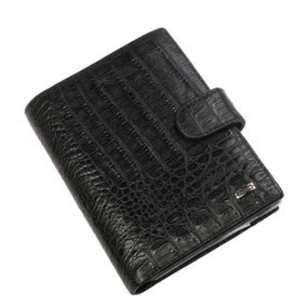 Портмоне вертикальное, застегивающееся клапаном с фактурой кожи крокодил. Отделений для банкнот – 3 (одно из них на змейке), отделение для монет, карманов для визиток и пластиковых карт – 3 Размер: 9.5*11.5*2 см.
