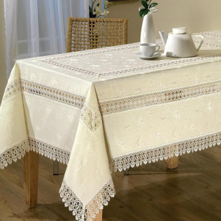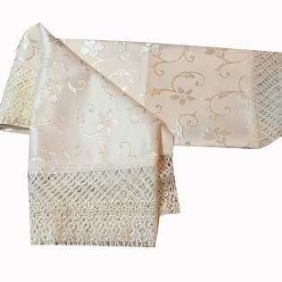 Жакардова скатертина 160-220 см із трьох ярусним мереживом бежева